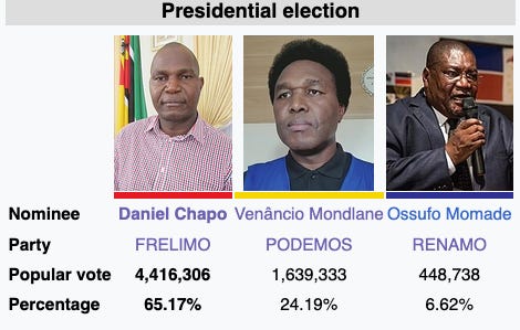 After the 2024 elections, there were large and deadly protests on behalf of Mondlane and PODEMOS in major cities. The first 2-3 months after the election saw 100+ deaths during protests, and Mondlane fled to South Africa at least twice. Mondlane and Chapo met in person earlier this year, and Mondlane has since founded a new party, ANAMALALA.5